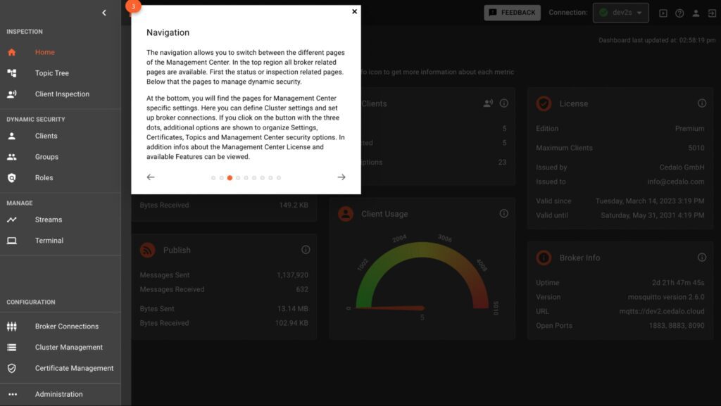 Feature Description: Our team has redesigned the dashboard and improved its usability. We added a chart showing the currently connected clients and the maximum allowed client connections based on the given license. We also grouped metrics to provide an even better overview of the current status of your broker instance.