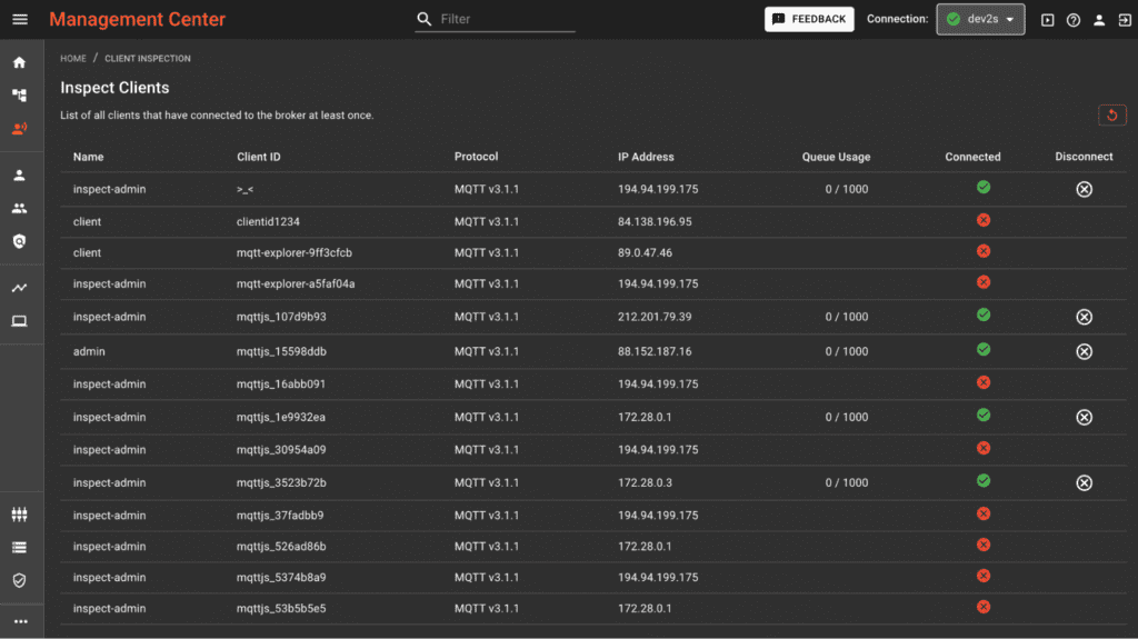 User benefit: Using the new Client Control UI, you no longer need to disconnect each MQTT client from the client side, saving you time and effort. Select the MQTT client you want to disconnect from the broker, and that client will instantly be disconnected. Whether you need to disconnect a device for maintenance, security reasons, or any other reason, the new feature simplifies the process. This feature makes the management of your broker network more efficient.
