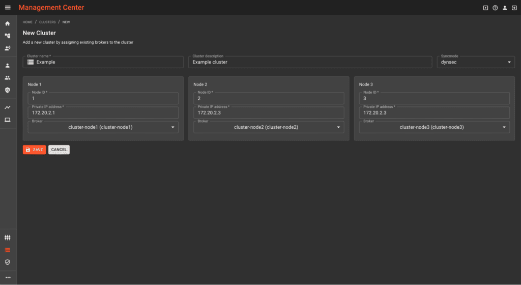 On the other hand, the Dynamic-Security Sync acts as an active-active cluster. Here, all three nodes can have clients connect to them simultaneously. However, just the dynamic security authentication is synchronized between nodes.
