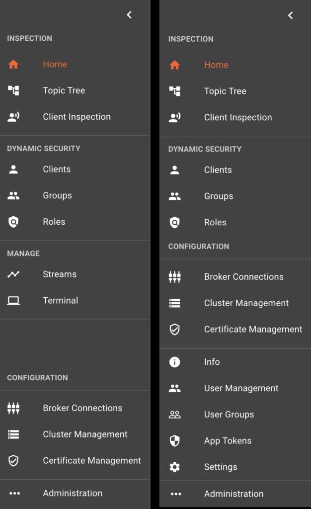 Feature description: We streamlined the menu and added more explicit labels and icons to help you quickly navigate within MMC. We also rearranged the menu items to visually separate information specific to a single broker or broker cluster from the global MMC information. You can find the broker/cluster-specific pages at the top of the navigation and MMC-specific pages at the bottom.