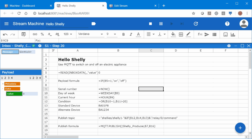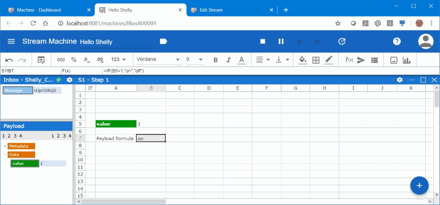 So far we only used on formula (converting 0/1 to “on”/”off”). Now as we have the events and the corresponding payload data in the Streamsheet, we can use the power of the build-in spreadsheet engine and start to build more fancy functionality.