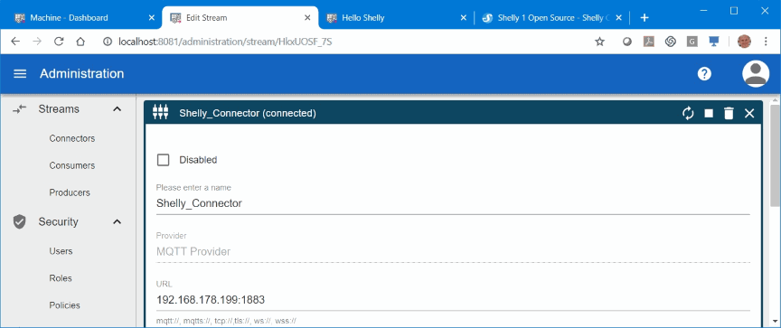 The first step is to open the Streamsheet admin console and create a connector to the MQTT broker. As in the Shelly device we will use the local IP Address of the broker (in my case it is 192.168.178.199) and port 1883 (which is standard port for MQTT).
