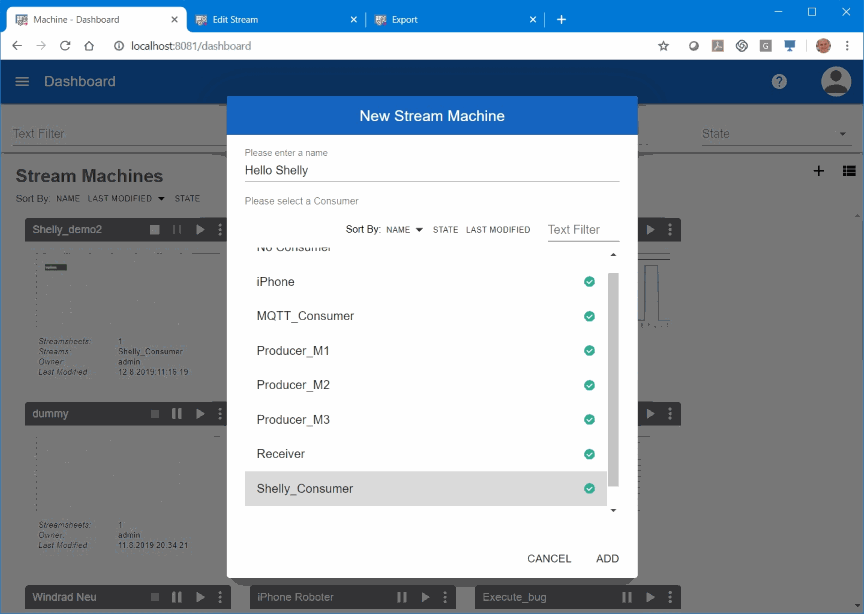 Now we are ready to create the Streamsheet itself. In the Streamsheet dashboard we select “New…” from the Menu. In the following dialog I chose the name “Hello Shelly” as name for the new Streamsheet and then I selected the consumer “Shelly Consumer” as the input stream for the the new Streamsheets.