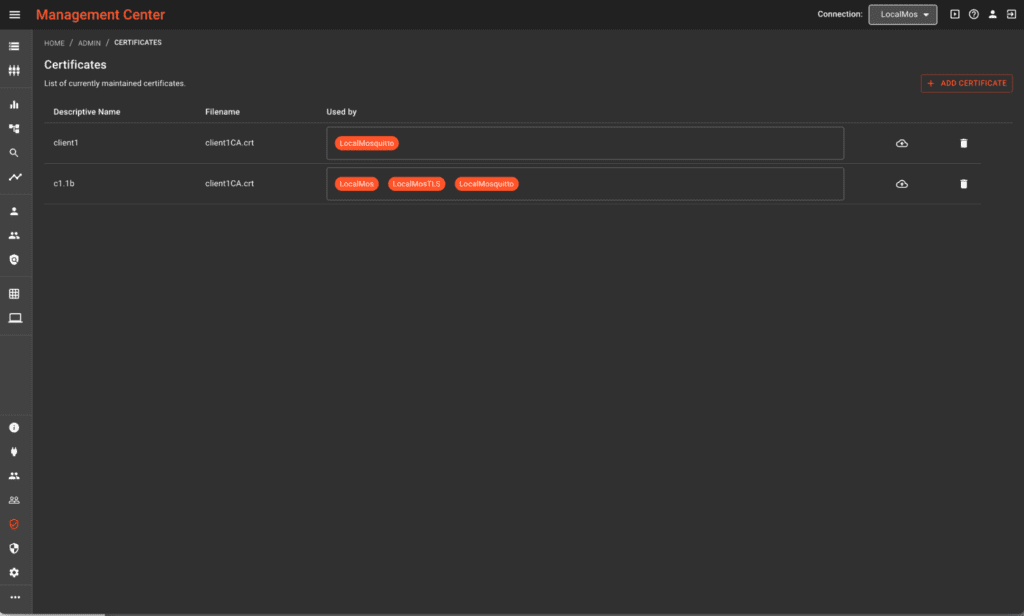 Feature Description: it is now possible to use Mosquitto Management Center (MMC) as a central place for managing Certificate Authority (CA) Certificates. This includes uploading CA certificates to the global MMC CA certificate store, deploying CA certificates to different Mosquitto broker instances, revoking CA certificates from broker instances, and removing them from the certificate store. We also provide the new Certificate Management MQTT API for system integrators to use this feature for automatic integrations.
