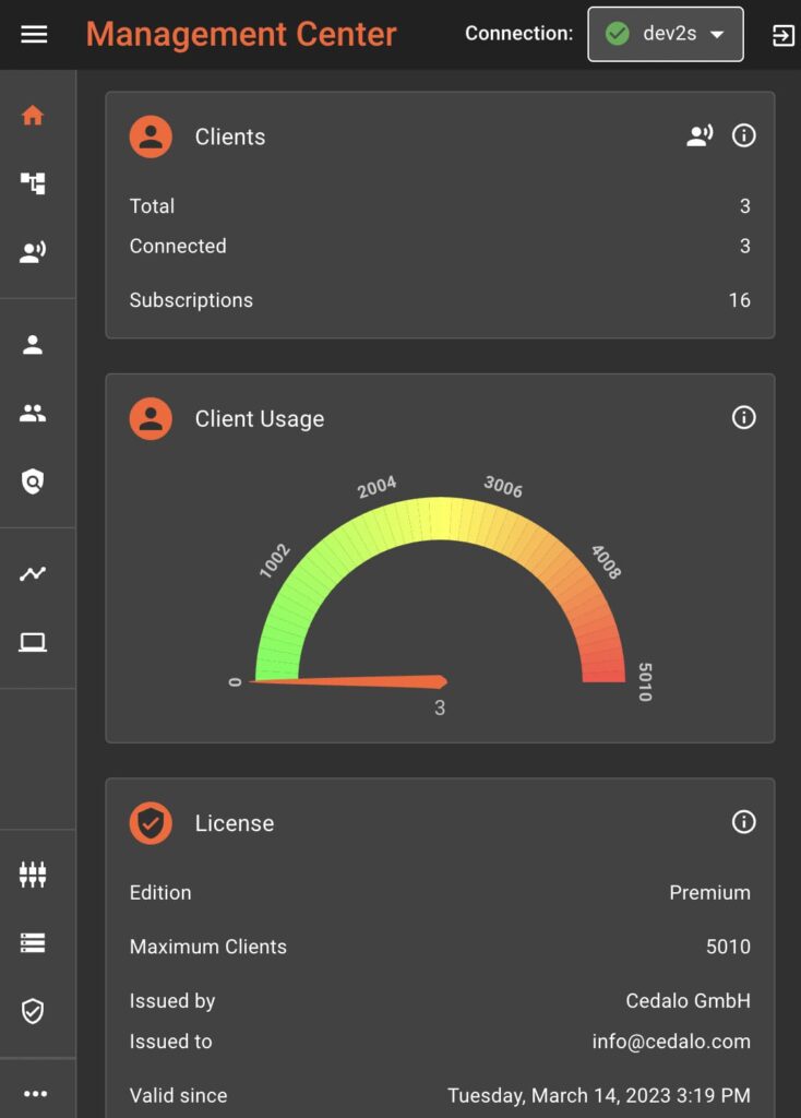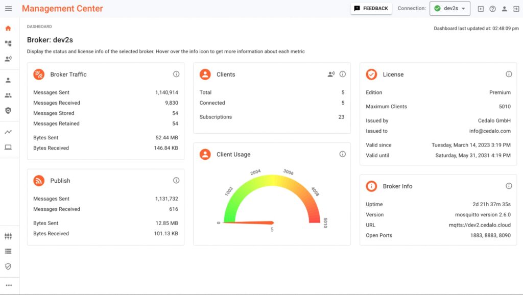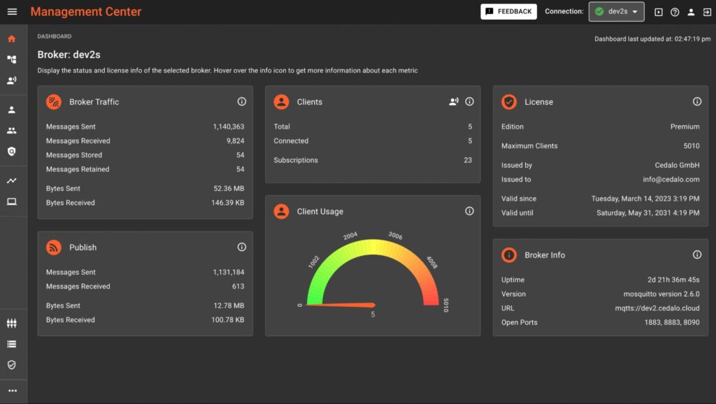 Feature Description: Our team has redesigned the dashboard and improved its usability. We added a chart showing the currently connected clients and the maximum allowed client connections based on the given license. We also grouped metrics to provide an even better overview of the current status of your broker instance.