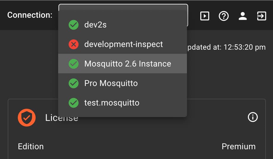 User benefit: With this feature, you can see the connectivity status of your Mosquitto instance directly from the broker select menu to identify any disconnected brokers easily. You will no longer need to navigate to a separate screen to check this information.