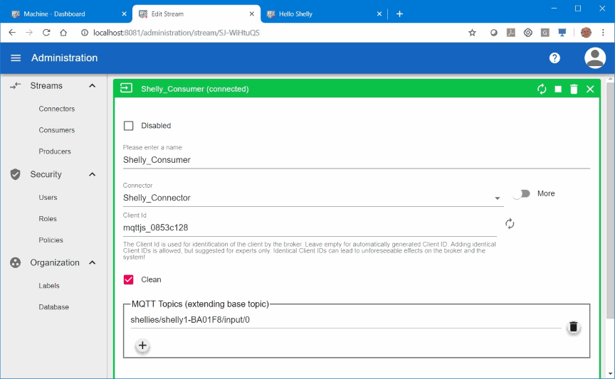 Once we have a MQTT connector, we can create a MQTT consumer. There we define the MQTT topics that we want to subscribe to on this broker. In our case this will be the topic “shellies/shelly1-BA01F8/input/0” which monitors the status of the switch input signal (SW). We name the consumer “Shelly_Consumer”.