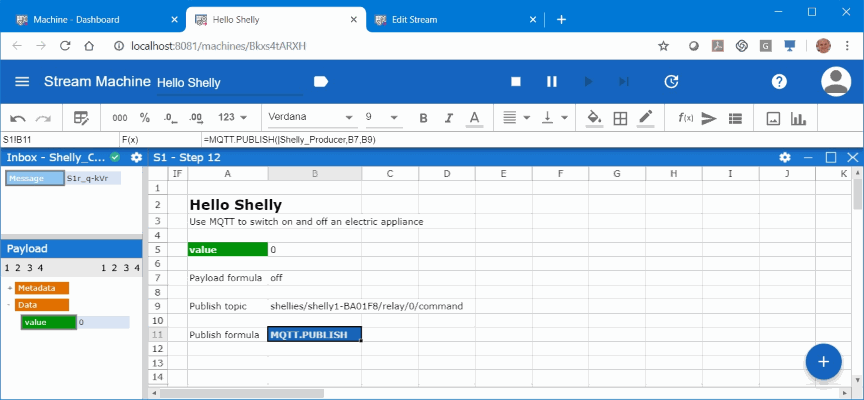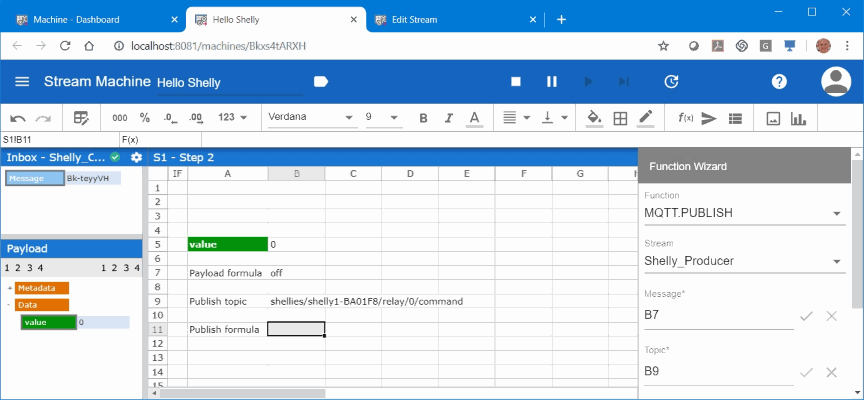 After hitting OK cell B11 has the formula MQTT.PUBLISH(|Shelly_Producer,B7,B9). It is not described here, but the Shelly_Producer has been created in the admin console before in almost the same way as we created the Shelly_Consumer before.
