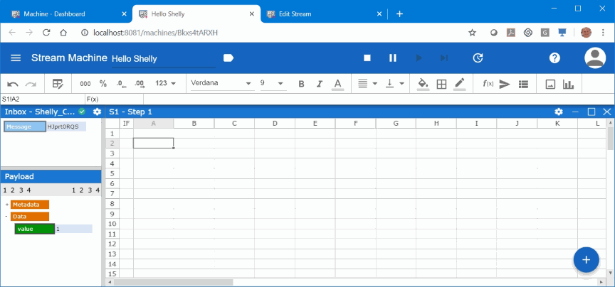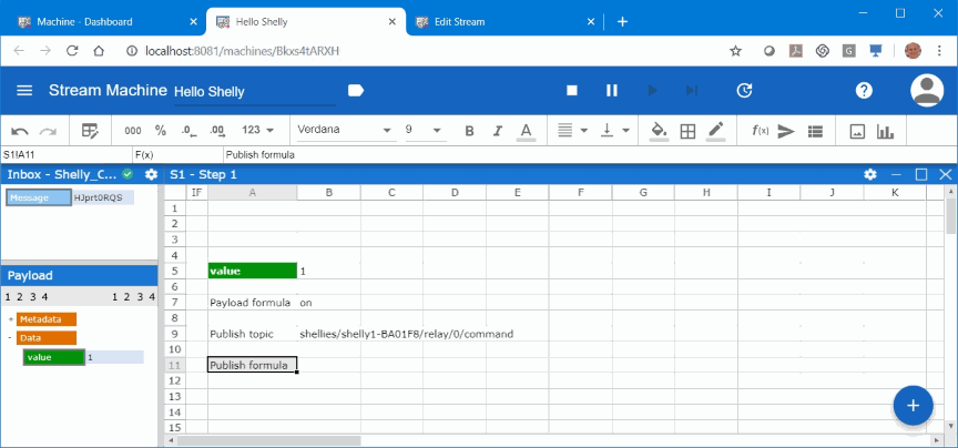 After hitting “ADD” in this dialog the server creates a new Streamsheet and connects the sheet to all incoming data from topic “shellies/shelly1-BA01F8/input/0”. To get the Streamsheet running and receiving data we press the play symbol on the right side of the blue menu bar. The second when the connected on/off switch is operated we get a MQTT message in the inbox on the left.