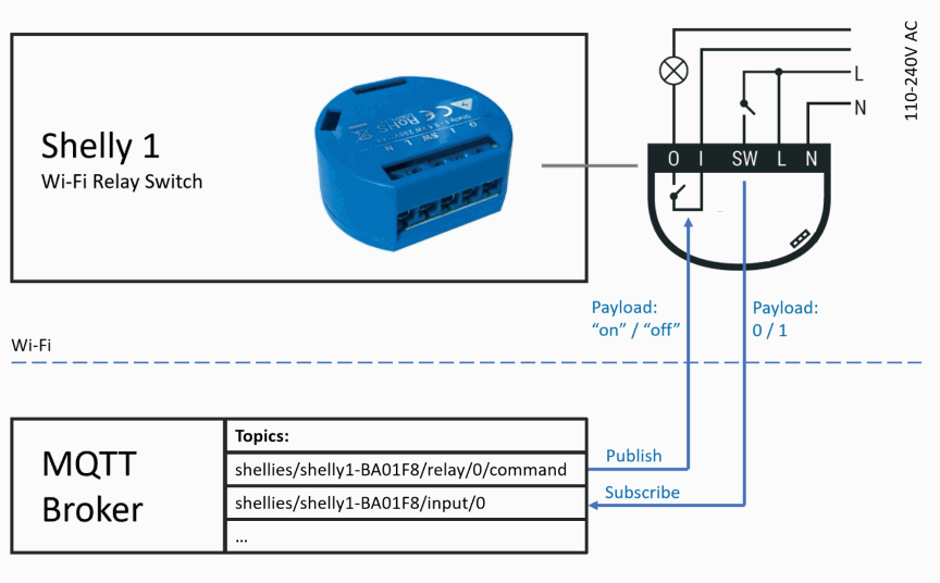 Shelly 1 is a Wi-Fi enabled home automation device that has a relay to control an electrical circuit and an input for detecting the status of a switch. Because Shelly 1 supports MQTT natively, you can monitor the status of the relay and the switch over MQTT. You can also set the on/off status of the relay via MQTT. In the following drawing you can see how things work together.